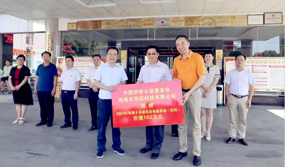 2019年7月25日,中国华侨公益基金会携珠海市司迈科技有限公司(以下简称司迈科技)来到毛主席故乡——湖南省湘潭市韶山市,为韶山市人民医院捐赠了价值102万元的等离子双极电切电凝微创手术设备(妇科)。